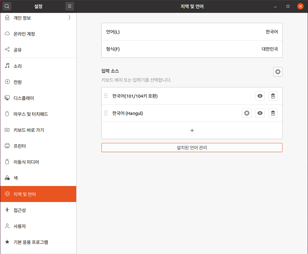 설정 -> 지역 및 언어에서 설치된 언어 관리 클릭
